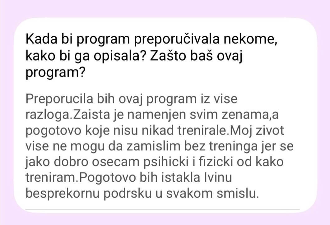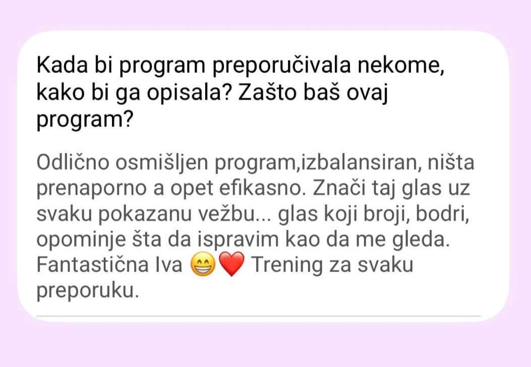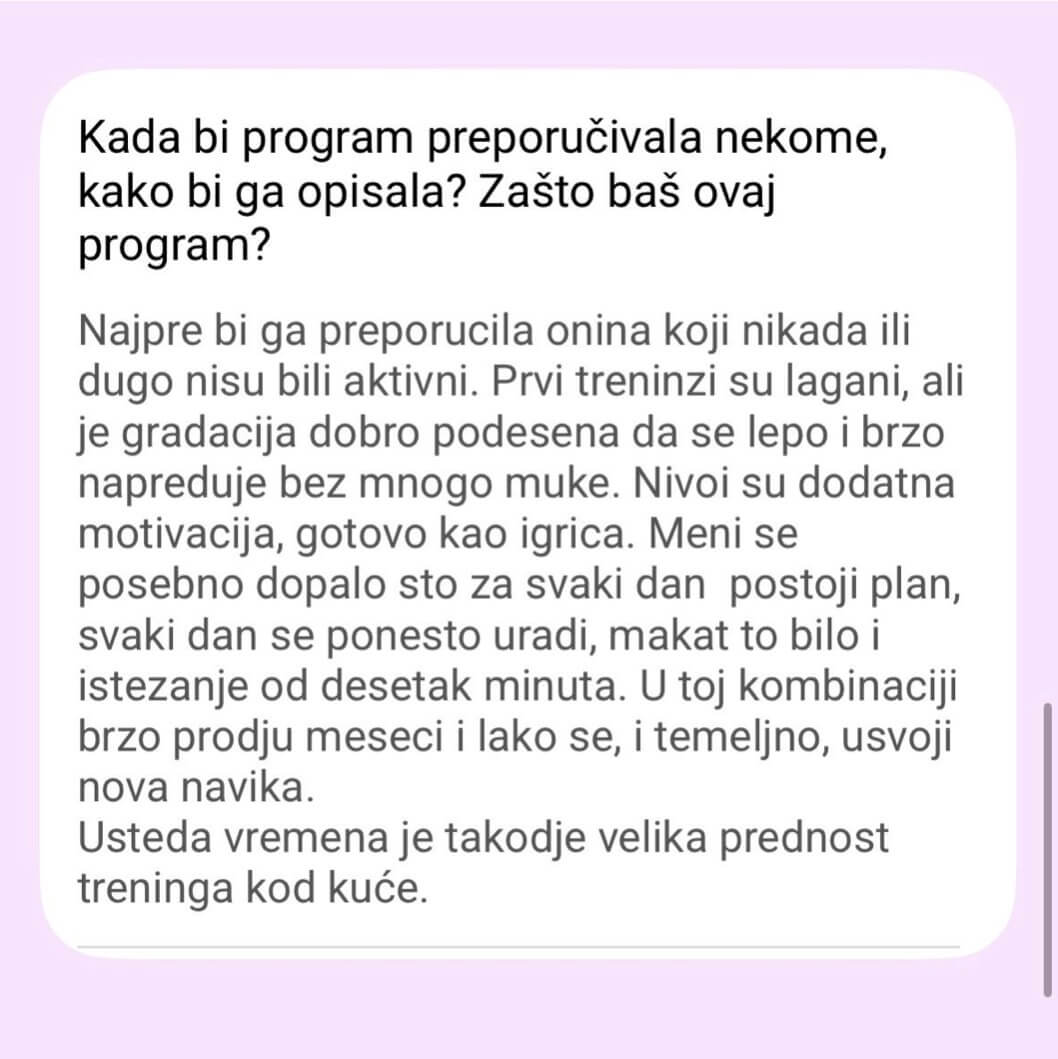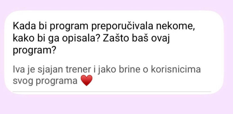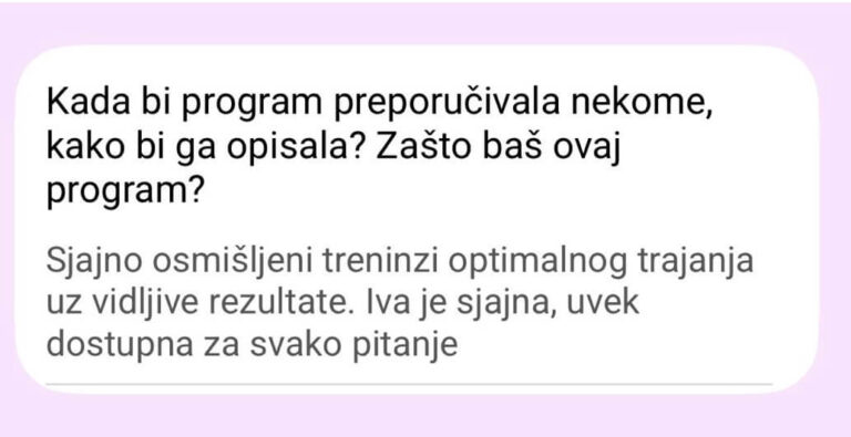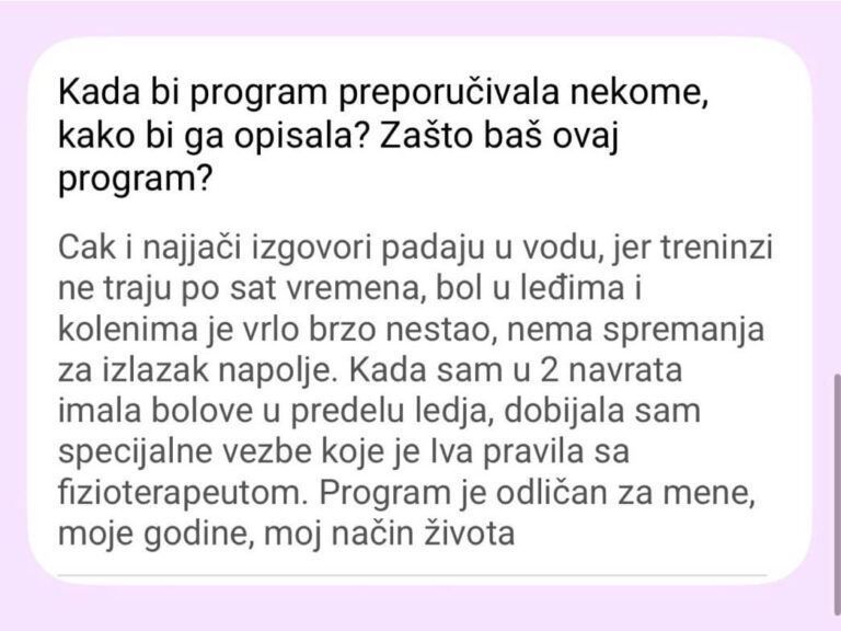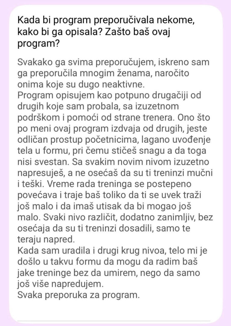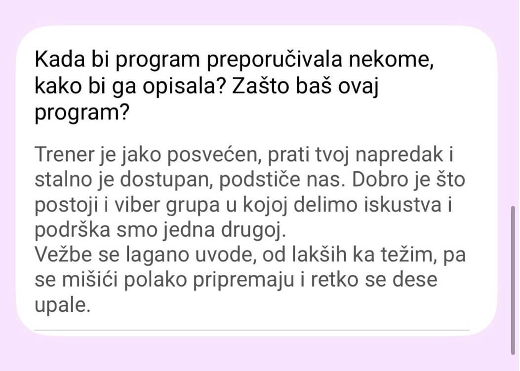 Ne postoji Viber grupa od 300 žena. Pristup je isključivo individualan – praćenje napretka, korekcije plana neograničen broj puta (zbog putovanja, bolesti, obaveza).