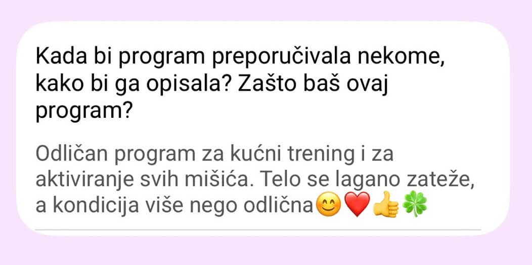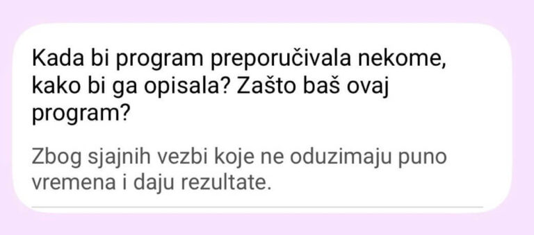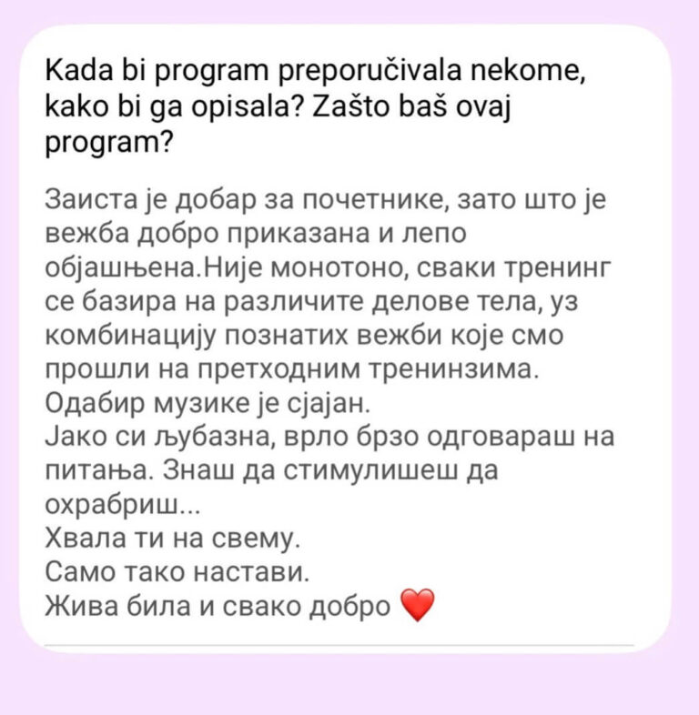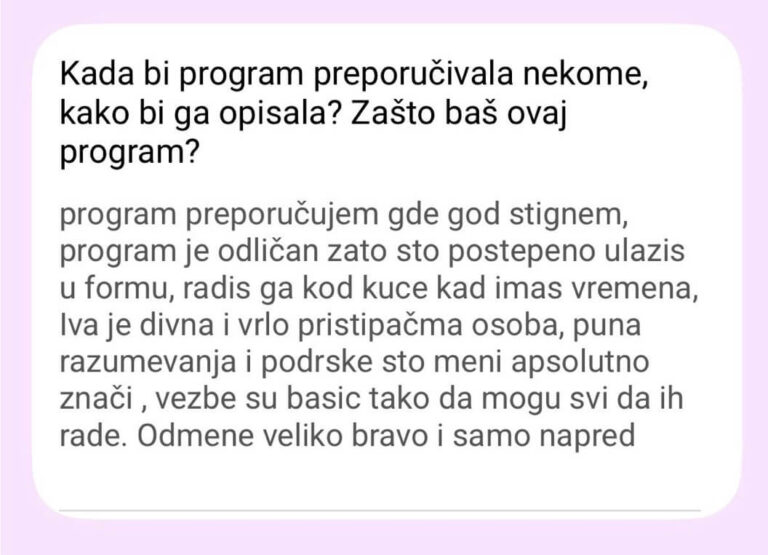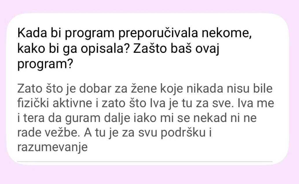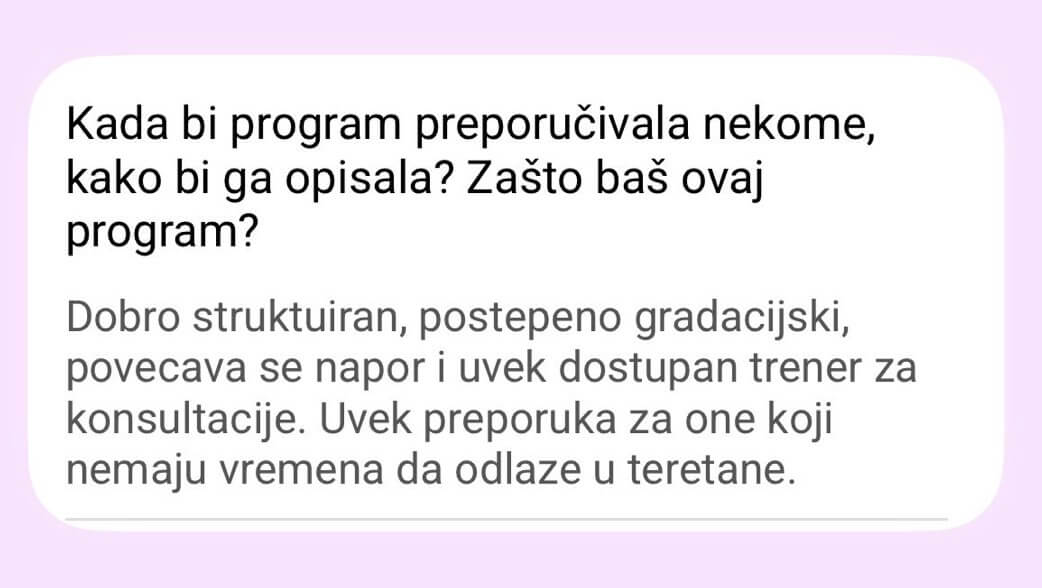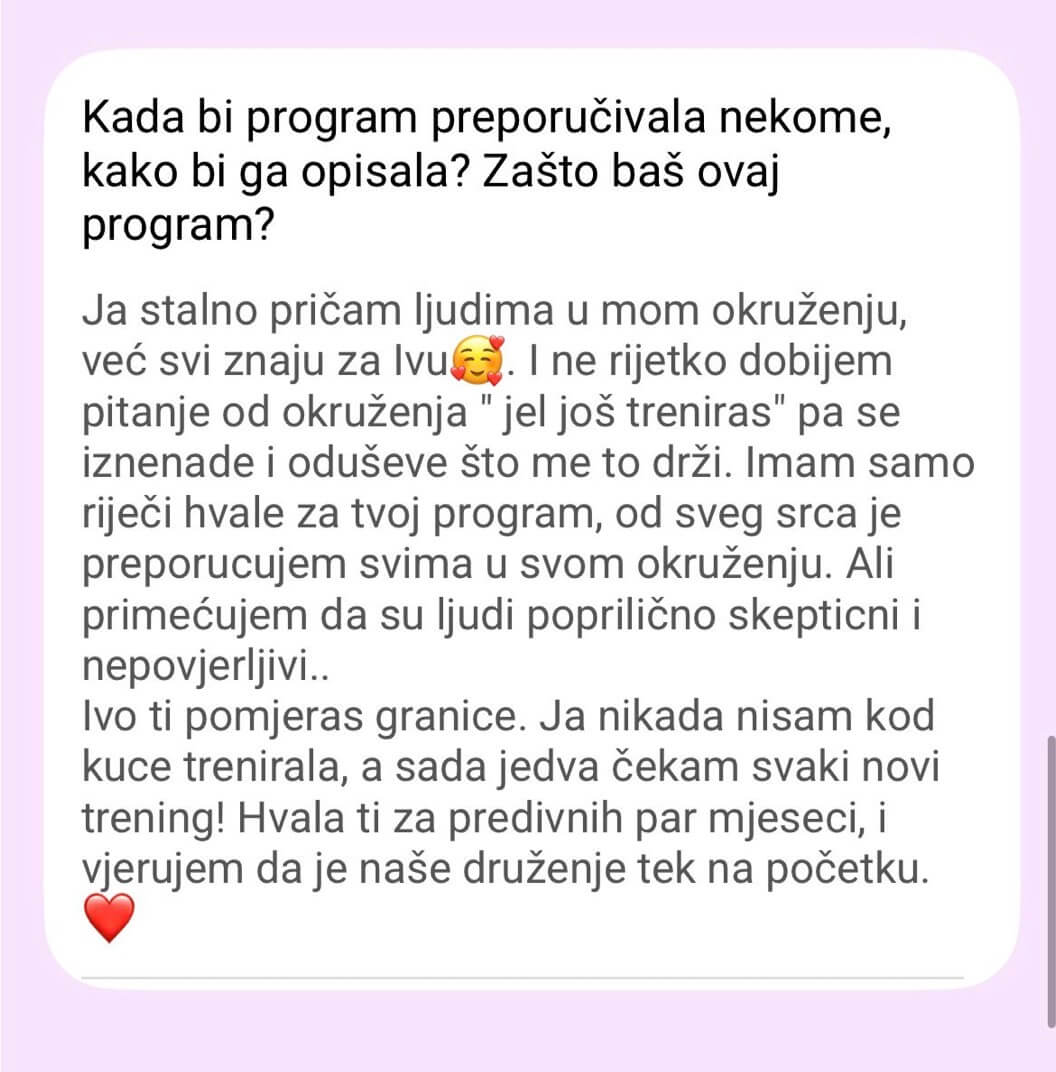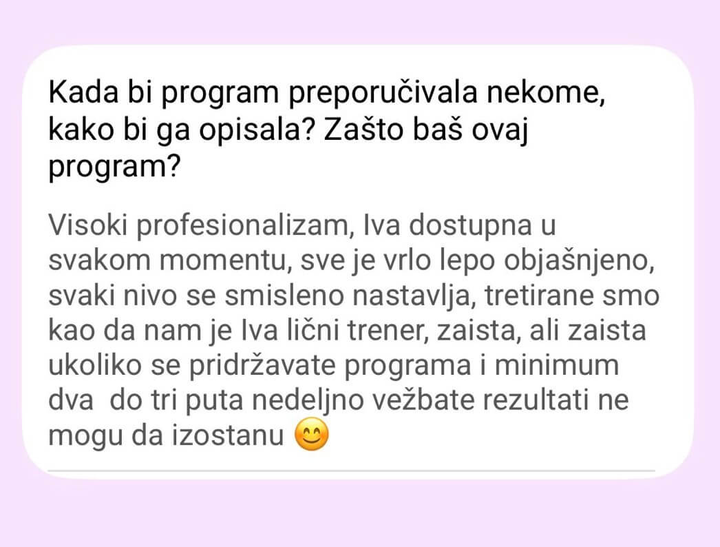 Ne postoji Viber grupa od 300 žena. Pristup je isključivo individualan – praćenje napretka, korekcije plana neograničen broj puta (zbog putovanja, bolesti, obaveza).